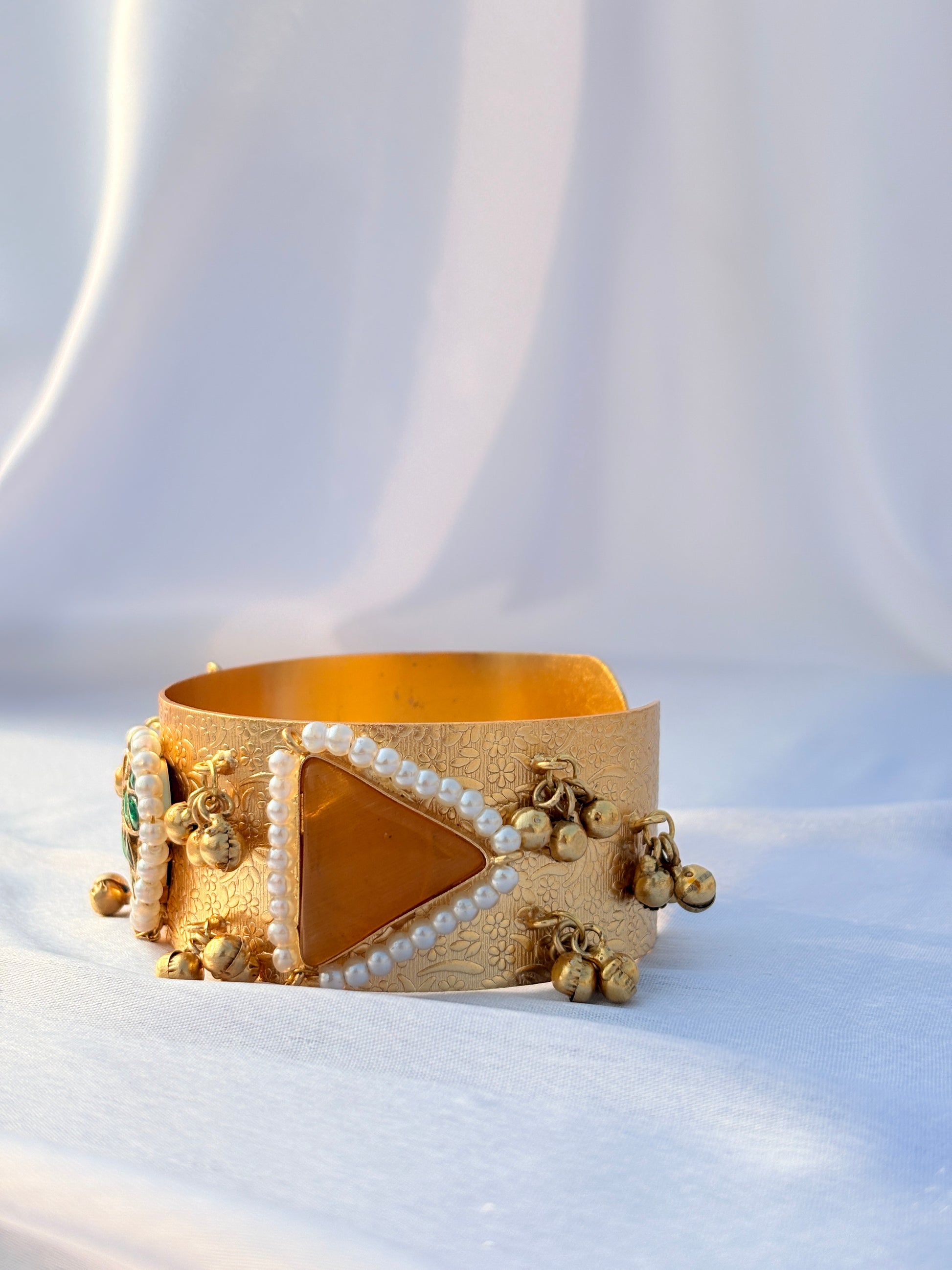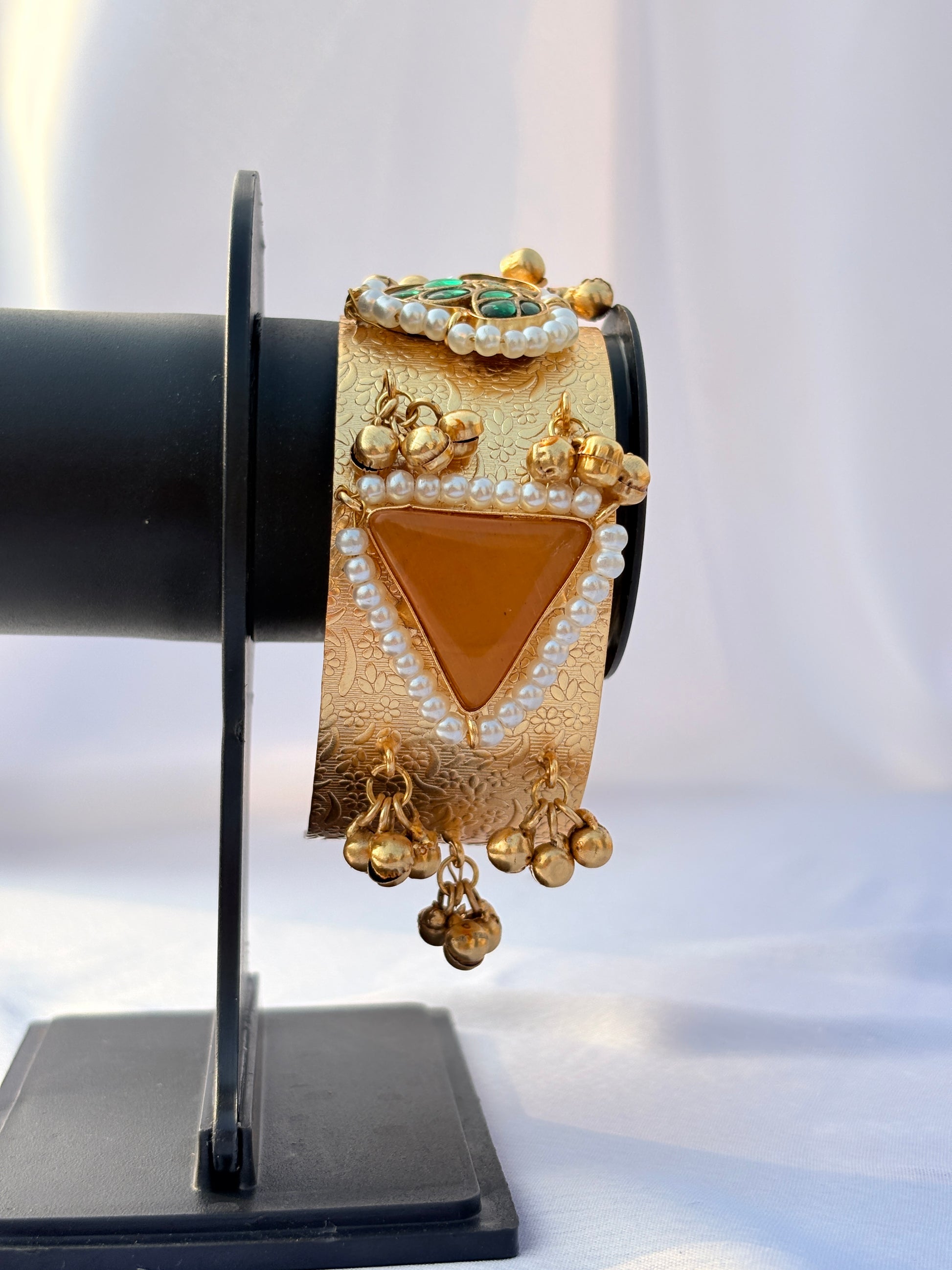 A statement gold-toned kada adorned with intricate floral embossing, luminous pearls, and rich emerald-green detailing at the center. Finished with delicate ghungroo charms that add graceful movement, this piece beautifully blends traditional craftsmanship with regal elegance—perfect for festive and ethnic ensembles.