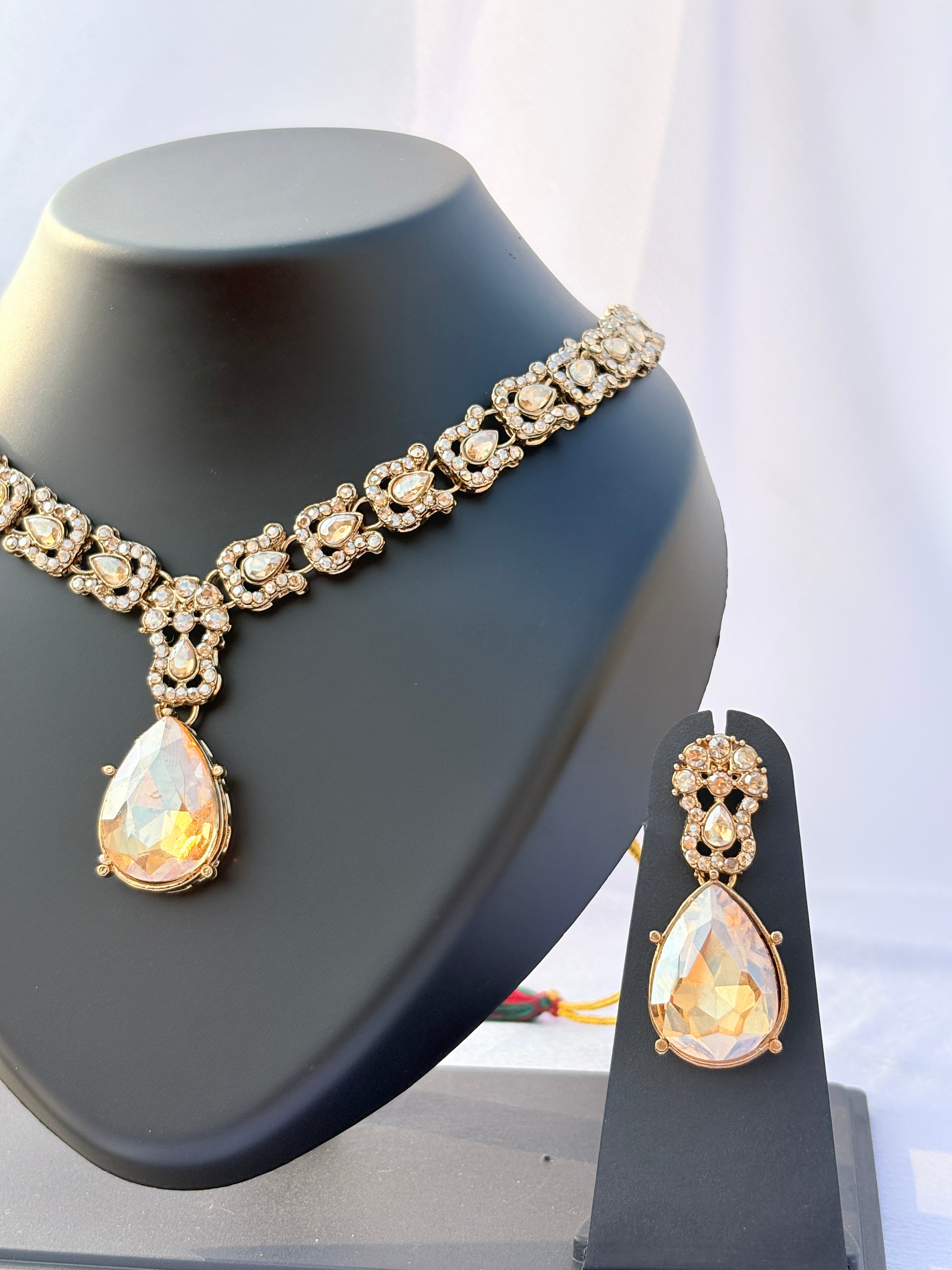 Graceful and luminous, the Ruhani Pearl Teardrop Necklace Set by Divine Luxe is designed to exude timeless sophistication. Featuring a delicately embellished necklace accented with a central teardrop pearl pendant, this set offers a perfect balance of elegance and charm. The matching earrings mirror the teardrop motif, creating a harmonious and refined look. Lightweight and comfortable, it is ideal for long celebrations. Perfect for weddings, receptions, and festive occasions, this set pairs beautifully with sarees, lehengas, and evening outfits. A classic choice for lovers of subtle luxury.