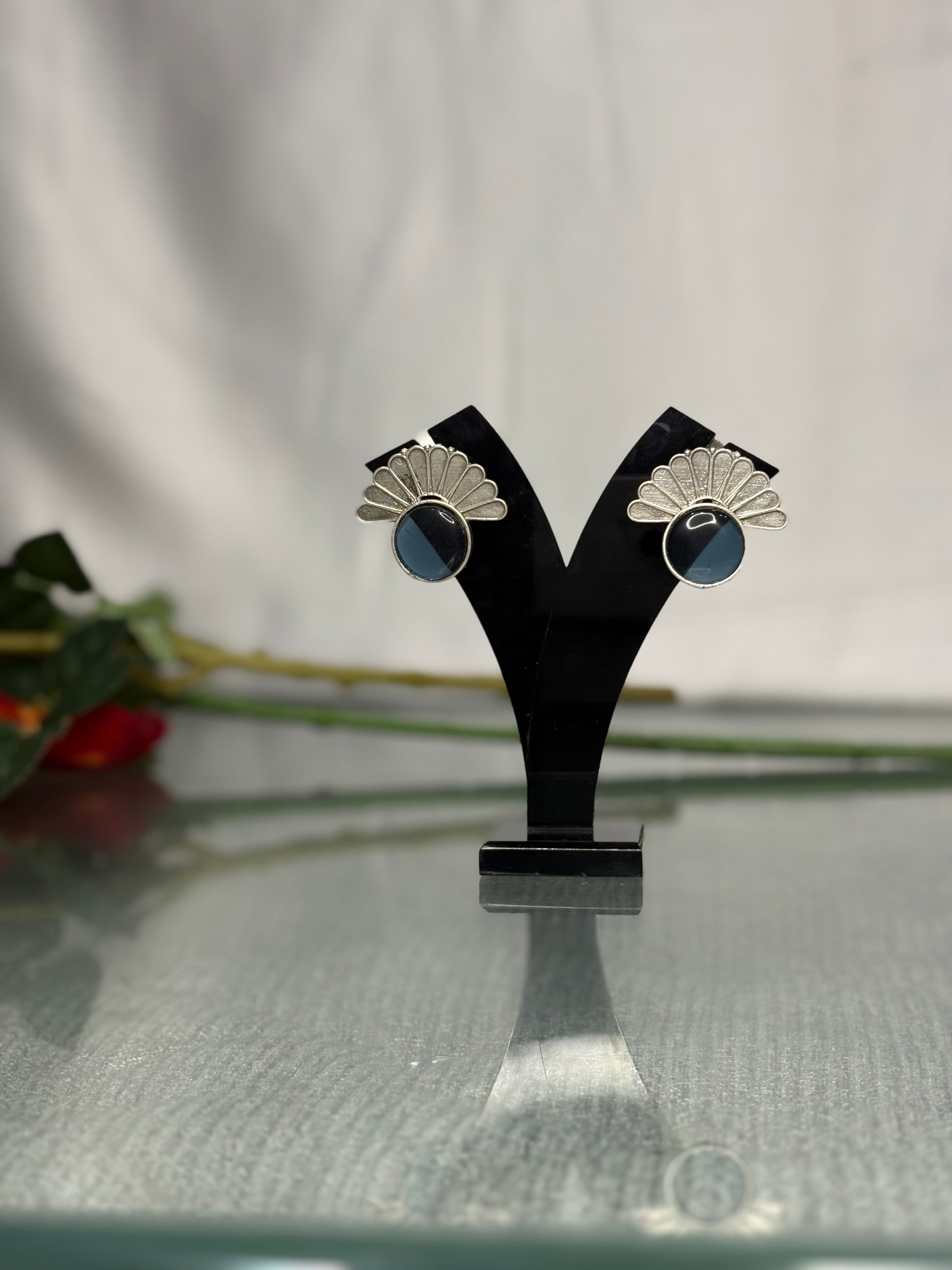 Discover bold elegance with Divine Luxe’s Neelaya Fan Crest Studs, a refined pair of handcrafted Indian earrings inspired by classical fan motifs and modern royal aesthetics. Featuring a deep sapphire-blue oval stone set against an intricately sculpted silver-toned fan frame, these studs strike the perfect balance between statement style and understated sophistication.