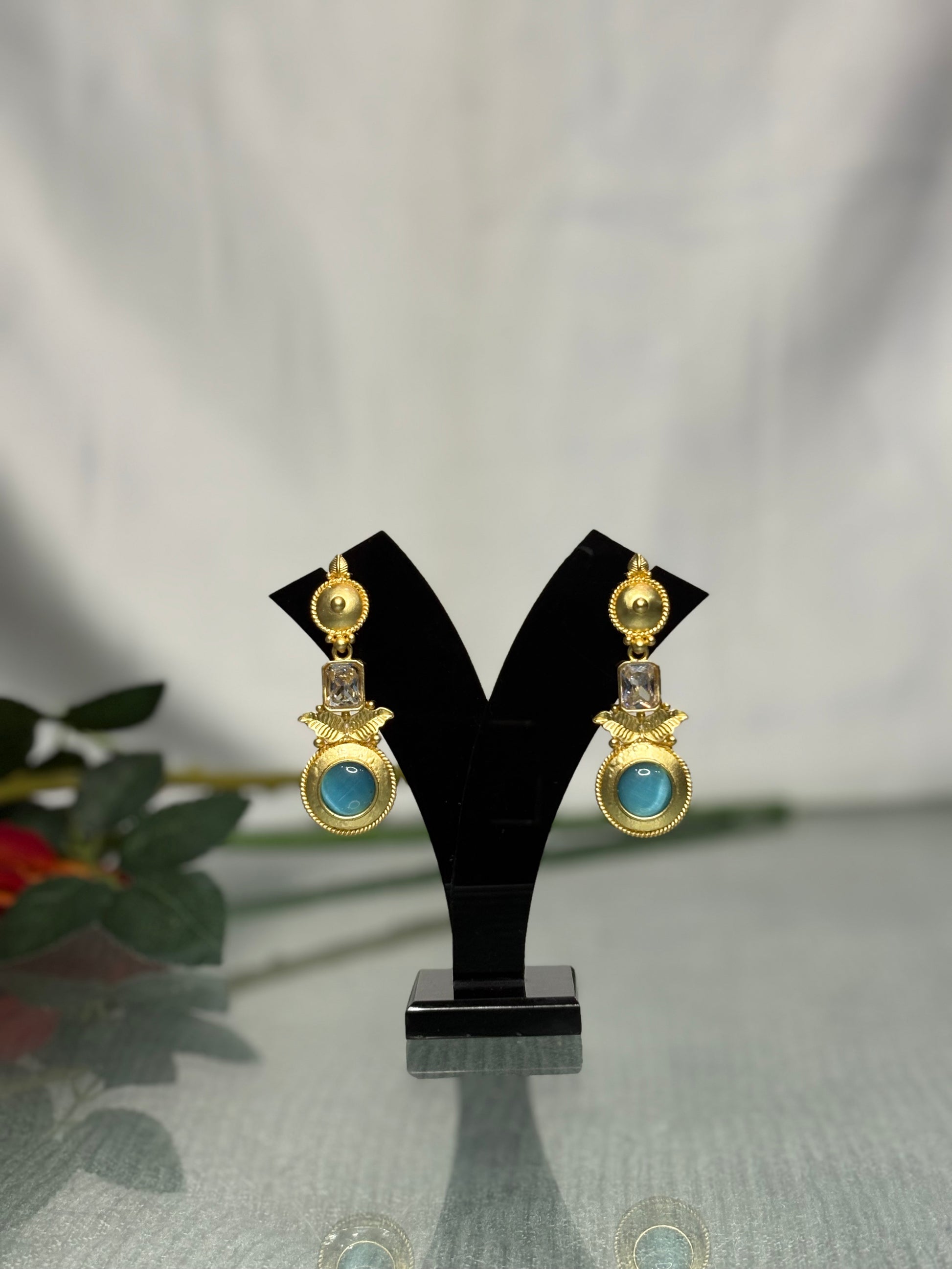 Channel regal elegance with Divine Luxe’s Neelima Gilded Aqua Drops, a refined pair of handcrafted Indian earrings inspired by royal heirloom jewellery. Featuring a luminous aqua-blue gemstone set within an ornate gold-toned circular frame and crowned with a textured antique stud, these earrings radiate timeless sophistication with a modern ethnic soul.
