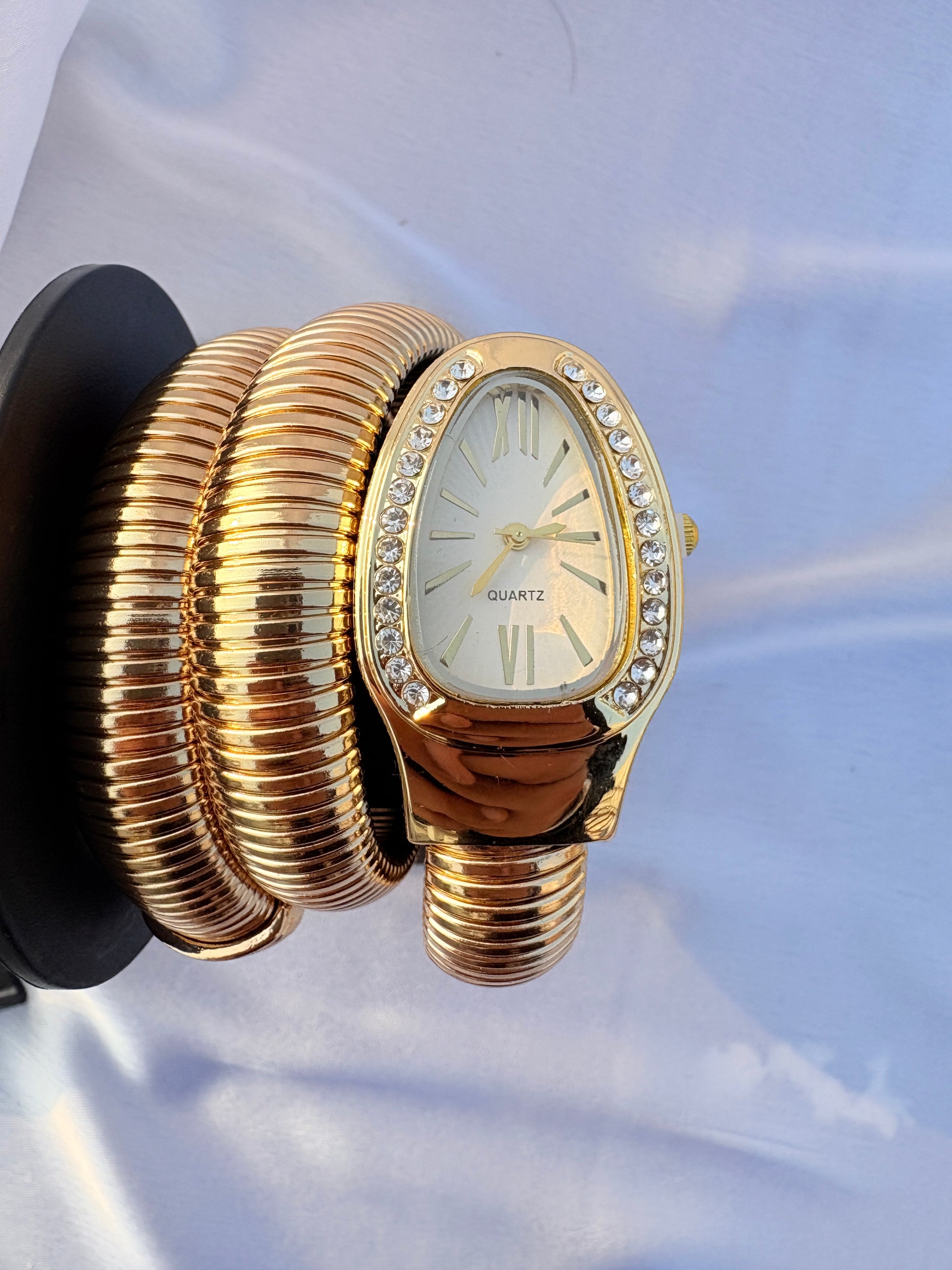 A bold wrap-style watch crafted in a radiant gold finish, designed to coil elegantly around the wrist. The oval dial is framed with shimmering crystal accents, adding a touch of refined glamour. Perfect for statement styling, this piece blends luxury, confidence, and timeless sophistication.