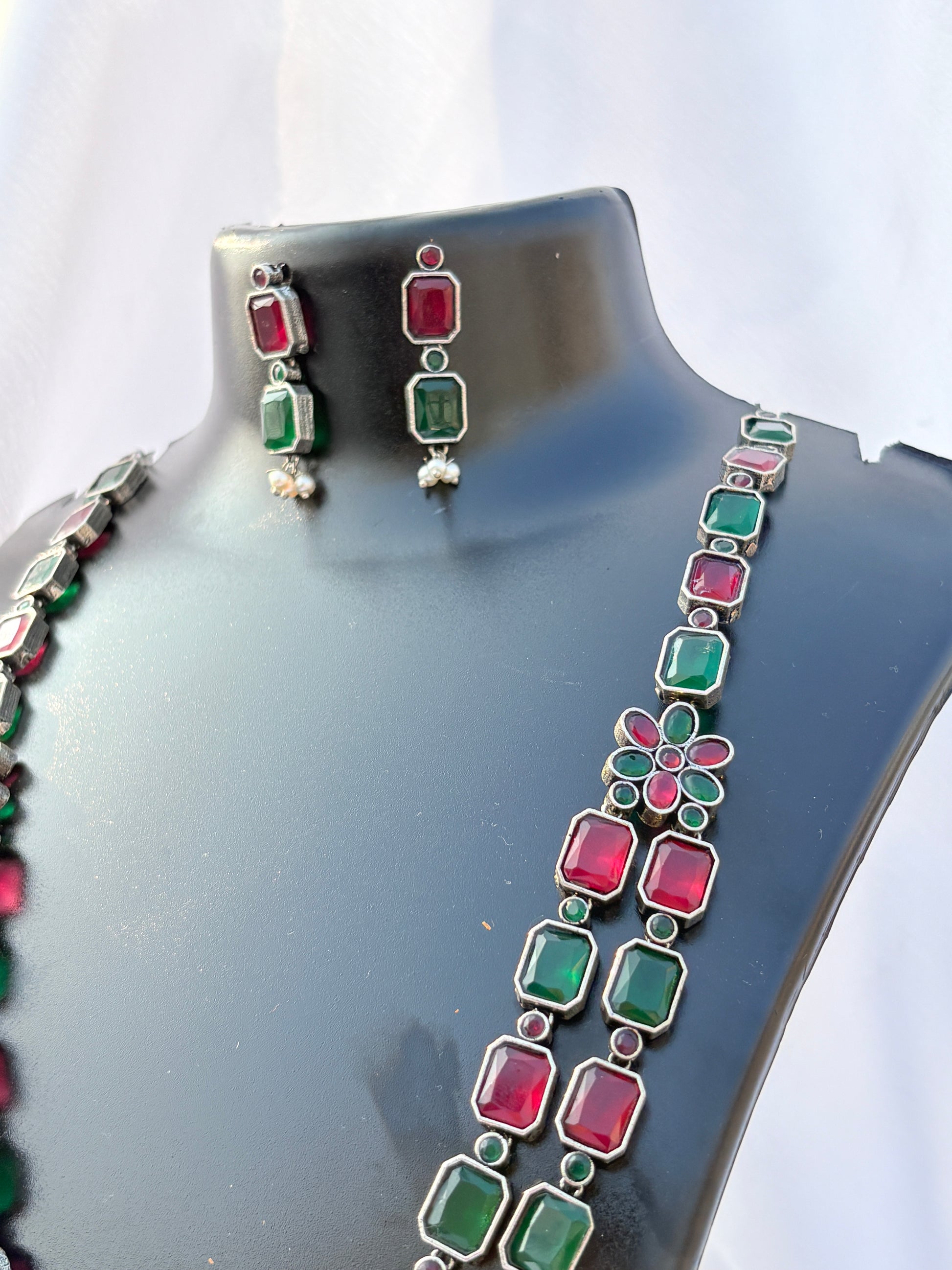 Bold and expressive, the Kalavati Tribal Chain Necklace Set by Divine Luxe celebrates traditional folk artistry with a contemporary edge. Crafted in an antique silver-toned finish, this set features layered chains accented with colourful enamel details that add vibrant character. The dangling elements create graceful movement, making it a striking statement piece. Paired with matching earrings, it offers a complete and balanced look. Perfect for festive gatherings, cultural events, and boho-inspired styling, this set pairs beautifully with sarees, kurtis, and Indo-western outfits. A unique choice for those who love jewellery with artistic soul.