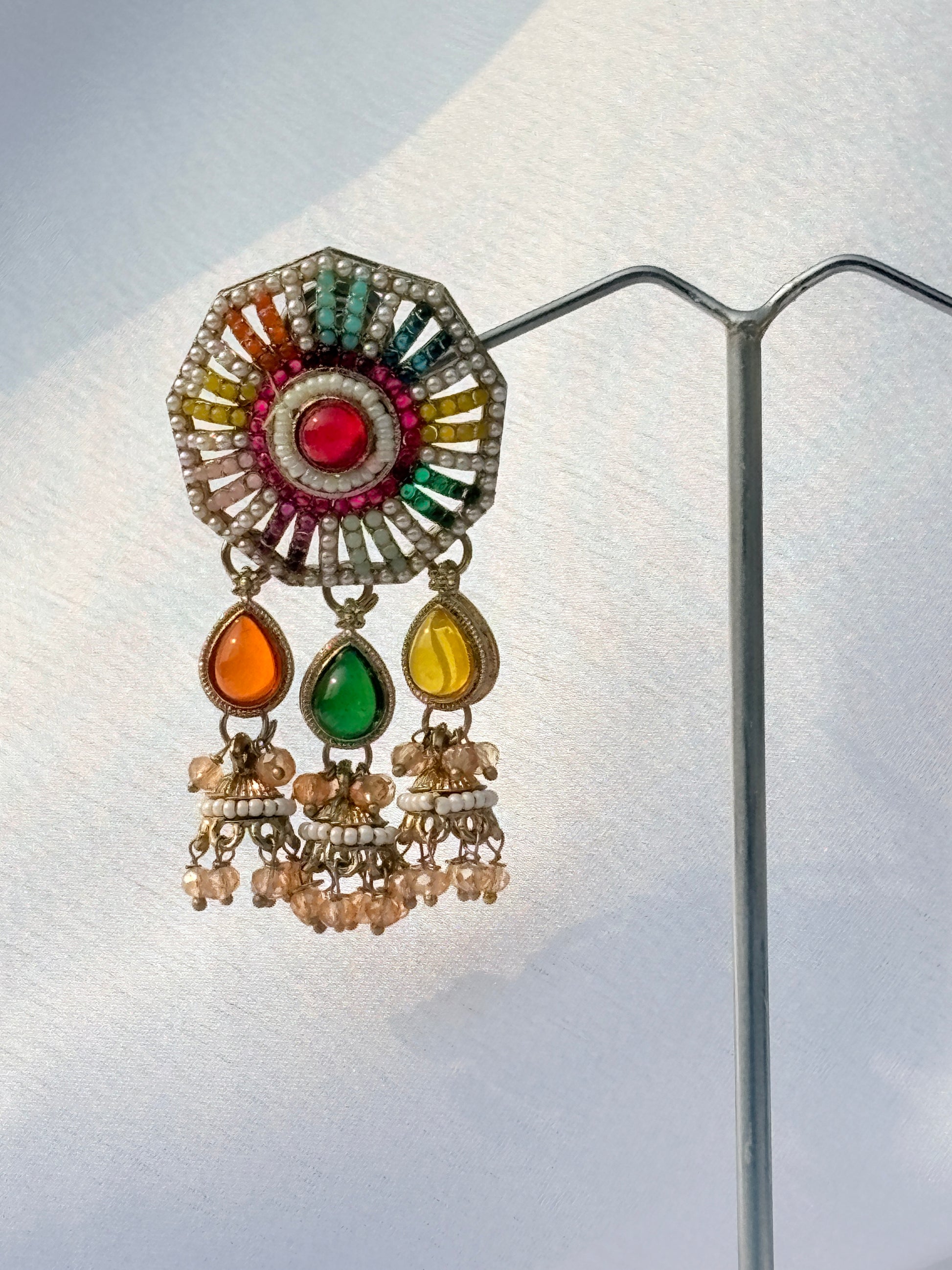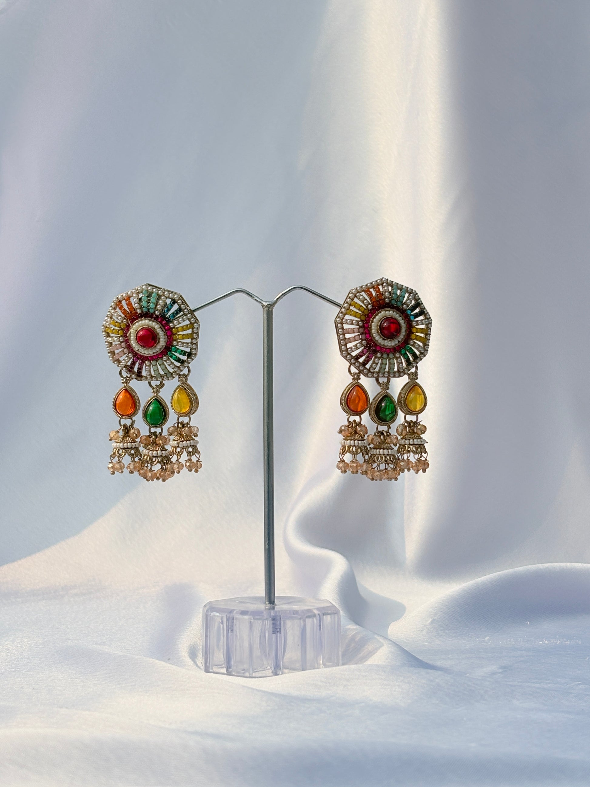 A vibrant blend of multi-coloured stones and pearl detailing, these Royal Mosaic Drops by Divine Luxe feature a bold circular motif with graceful dangling drops. Finished with delicate bead clusters, they add a festive pop of colour to any ethnic look.