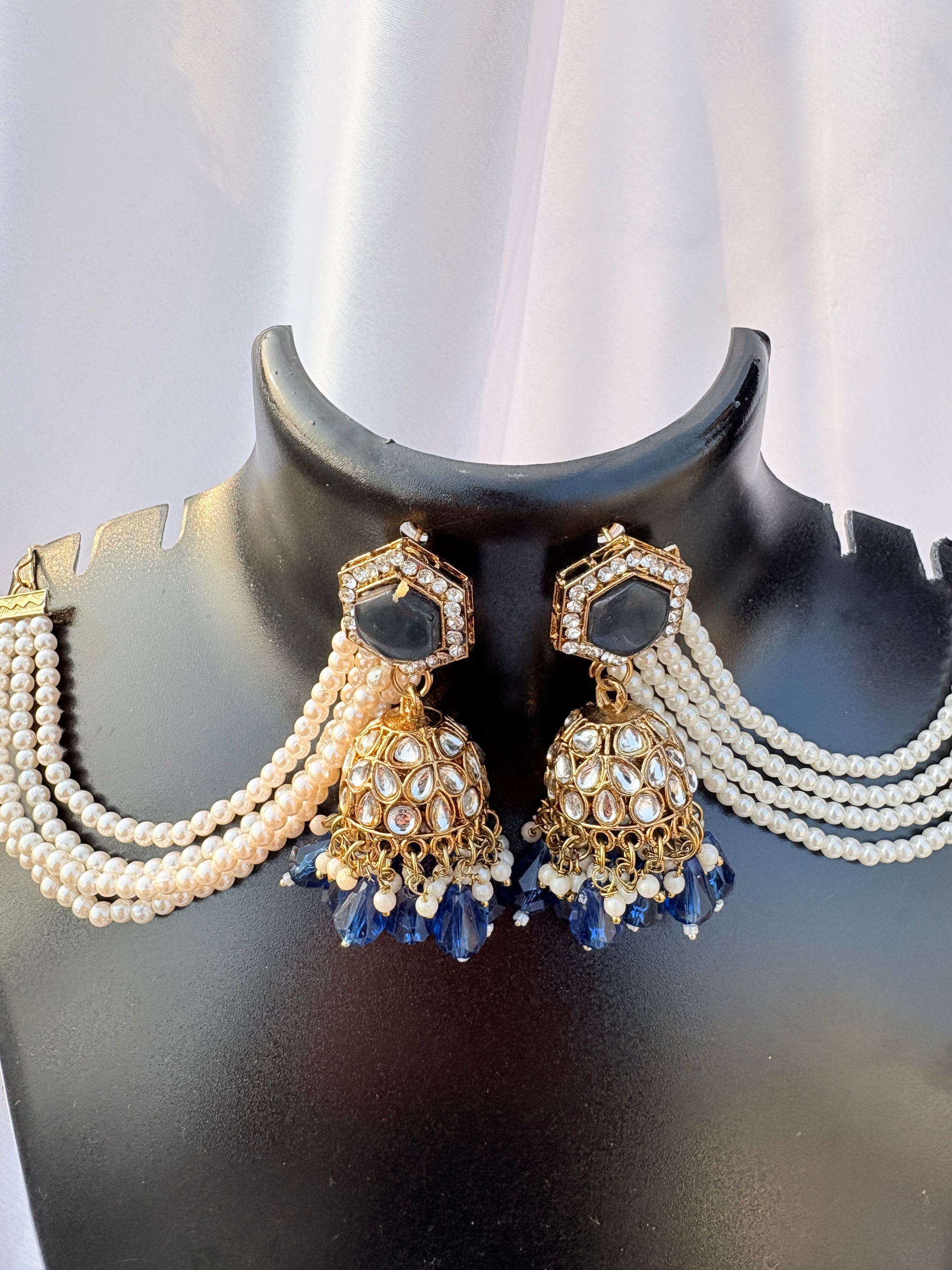 Elevate your ethnic look with these Rajwada Neel Pearl Bahubali Jhumkas, crafted in a regal antique gold finish. Adorned with hand-set kundan work, deep blue bead drops, and layered pearl chains, they exude royal charm. The bold Bahubali design frames the face beautifully, making them perfect for weddings and festive occasions. A timeless statement piece that blends traditional elegance with grandeur.