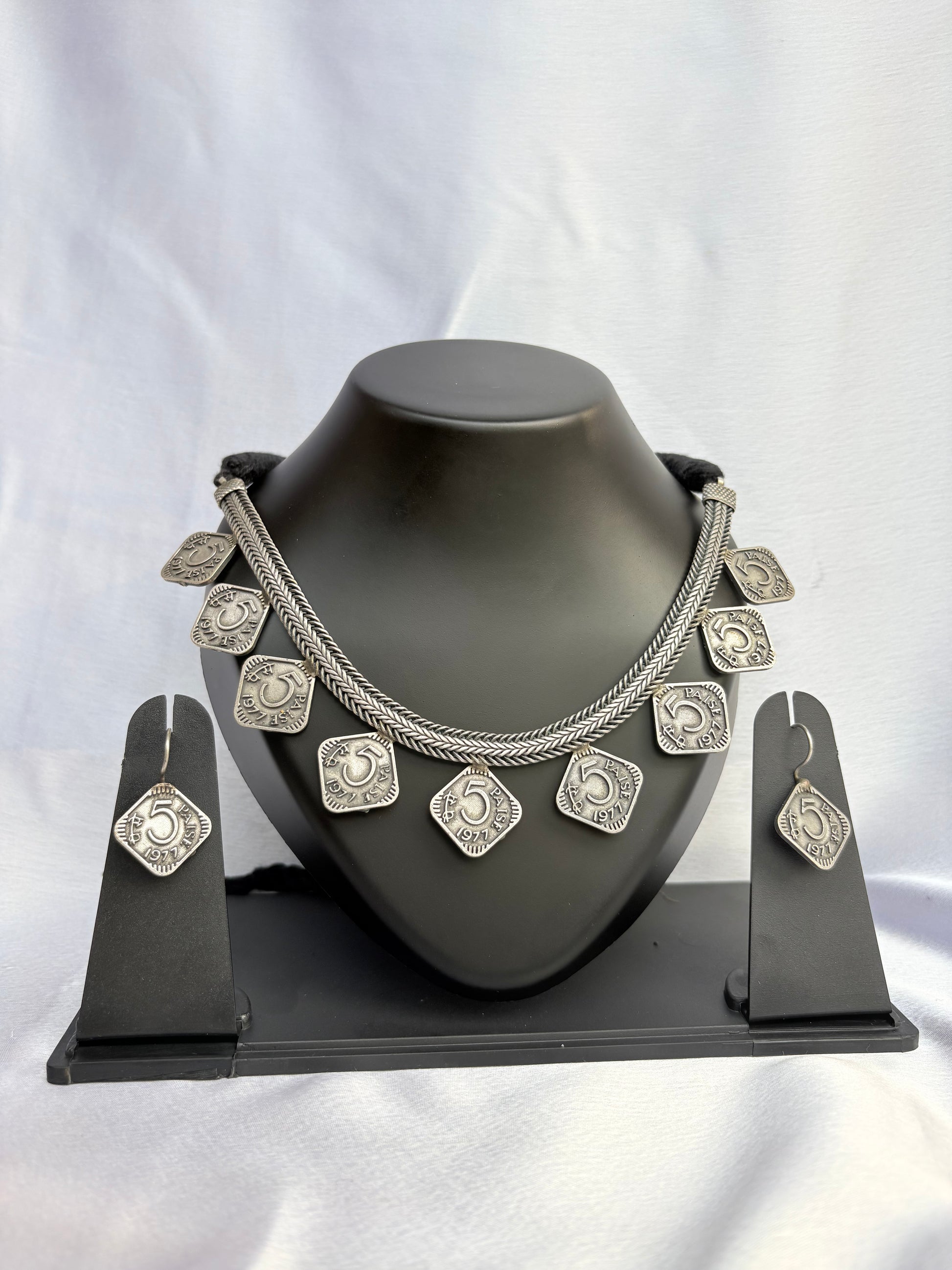 Each coin element showcases intricate floral engravings, creating depth and texture that highlight artisanal skill. The antique silver finish enhances the vintage appeal, while the structured necklace silhouette sits gracefully along the neckline, offering both comfort and statement-worthy style.