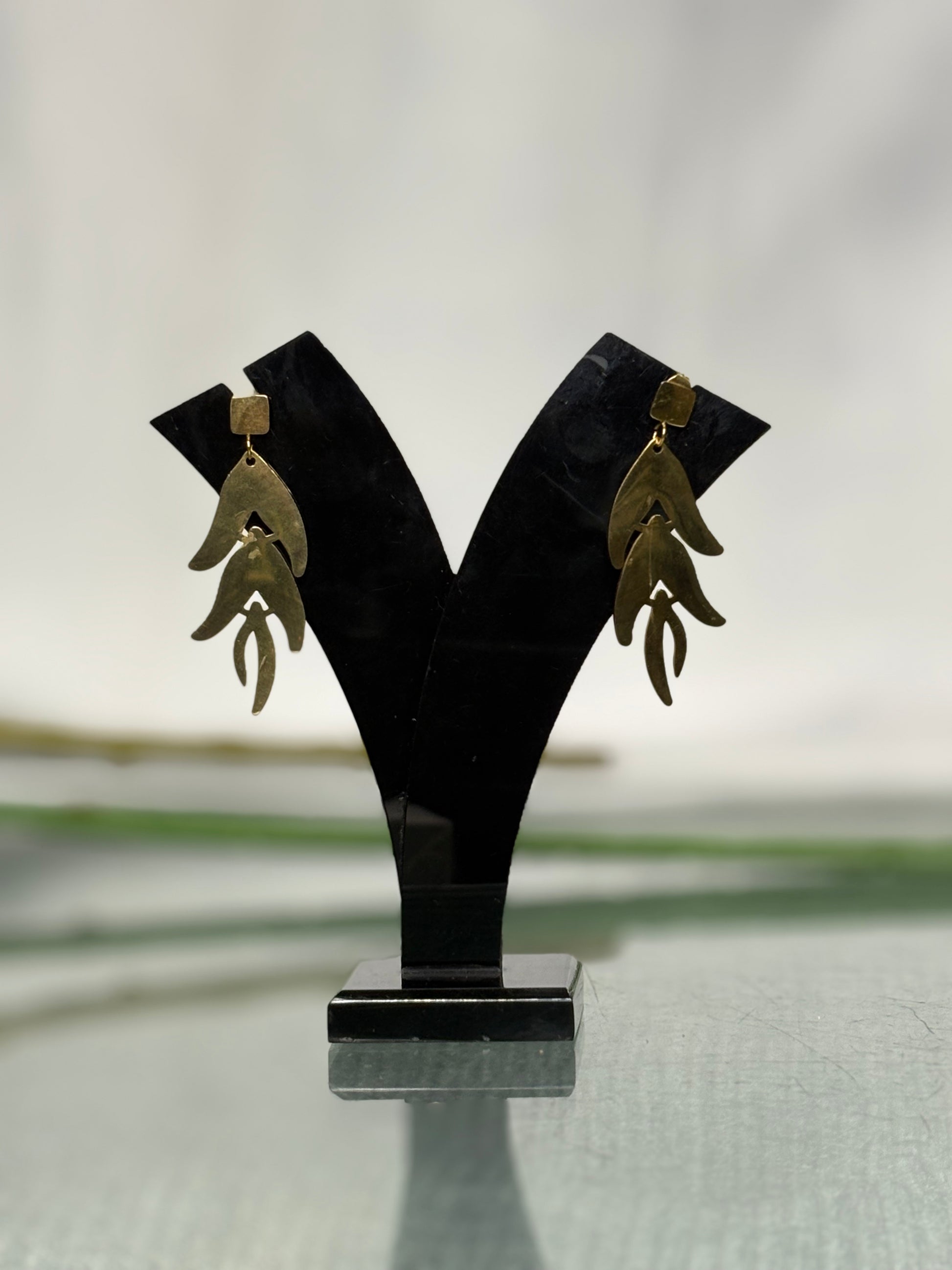 Celebrate raw elegance with Divine Luxe’s Vanyaa Tribal Leaf Danglers, a bold pair of handcrafted Indian earrings inspired by earthy motifs and indigenous artistry. Designed with layered leaf-shaped elements in an antique brass finish, these earrings reflect a harmonious blend of tribal heritage and contemporary bohemian charm.