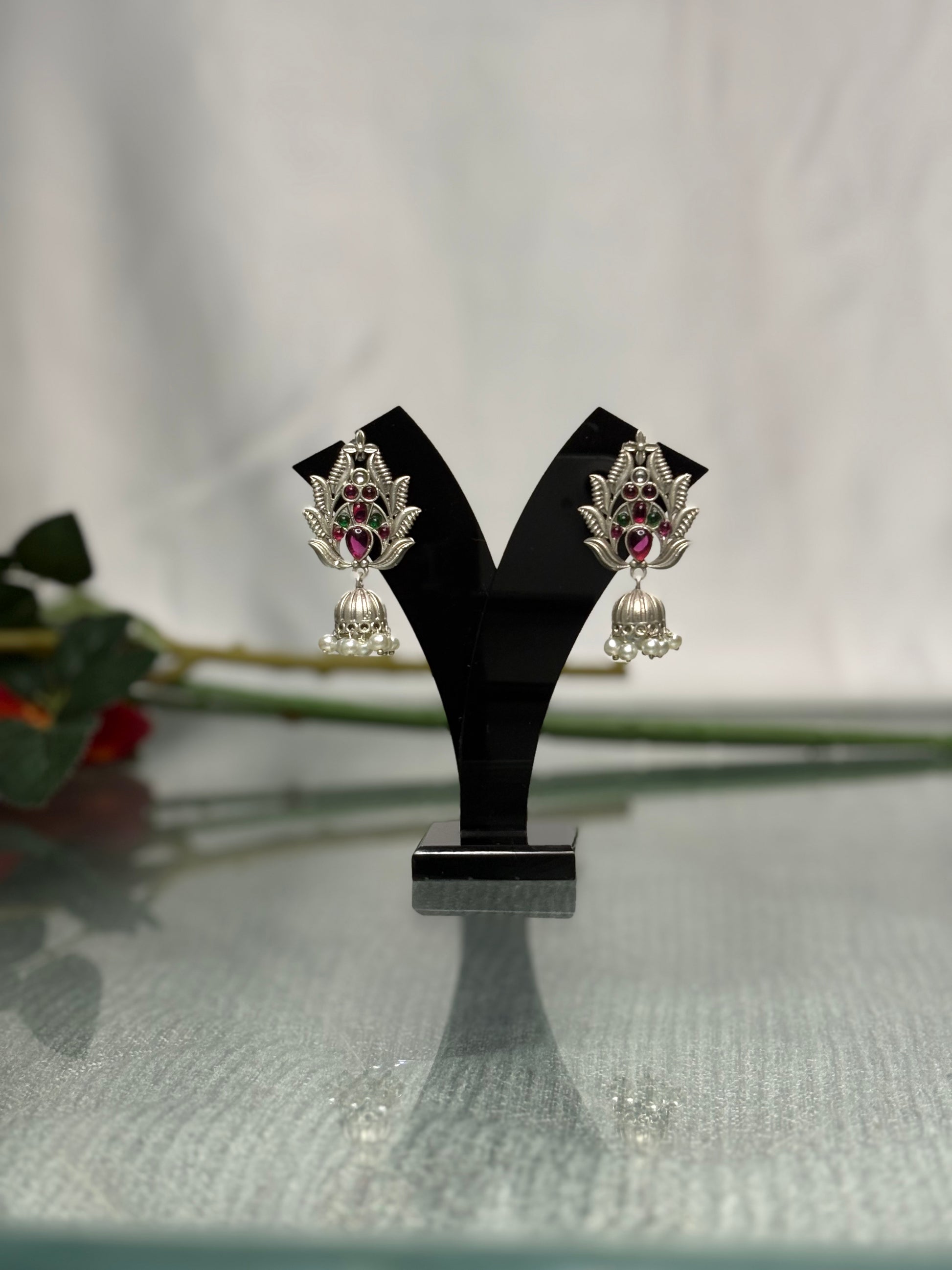 Experience refined royal beauty with Divine Luxe’s Rangriti Floral Jhumkas, a graceful pair of handcrafted Indian earrings designed to embody elegance and timeless charm. Featuring a rich ruby-red teardrop stone framed with premium kundan-style setting and paired with a luminous pearl stud, these earrings create a perfect balance of traditional artistry and modern sophistication.