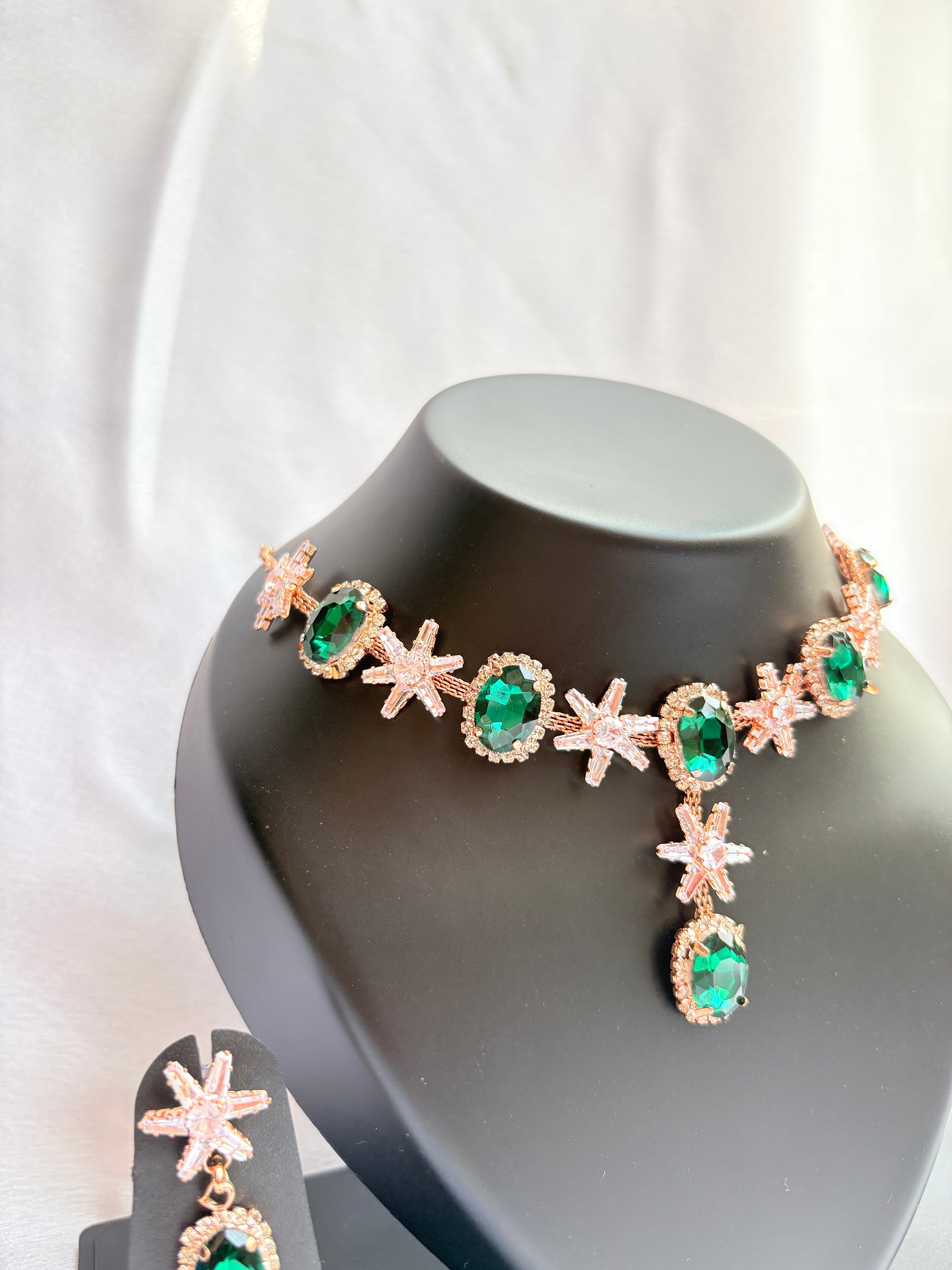 Perfect for engagement ceremonies, festive gatherings, weddings, cocktail events, and elegant ethnic styling, this floral emerald necklace set pairs effortlessly with sarees, lehengas, anarkalis, and Indo-western outfits. Whether worn as a daytime festive accent or an evening statement, the Zehra Garden Bloom Necklace Set by Divine Luxe brings romance, freshness, and timeless sophistication to every look.