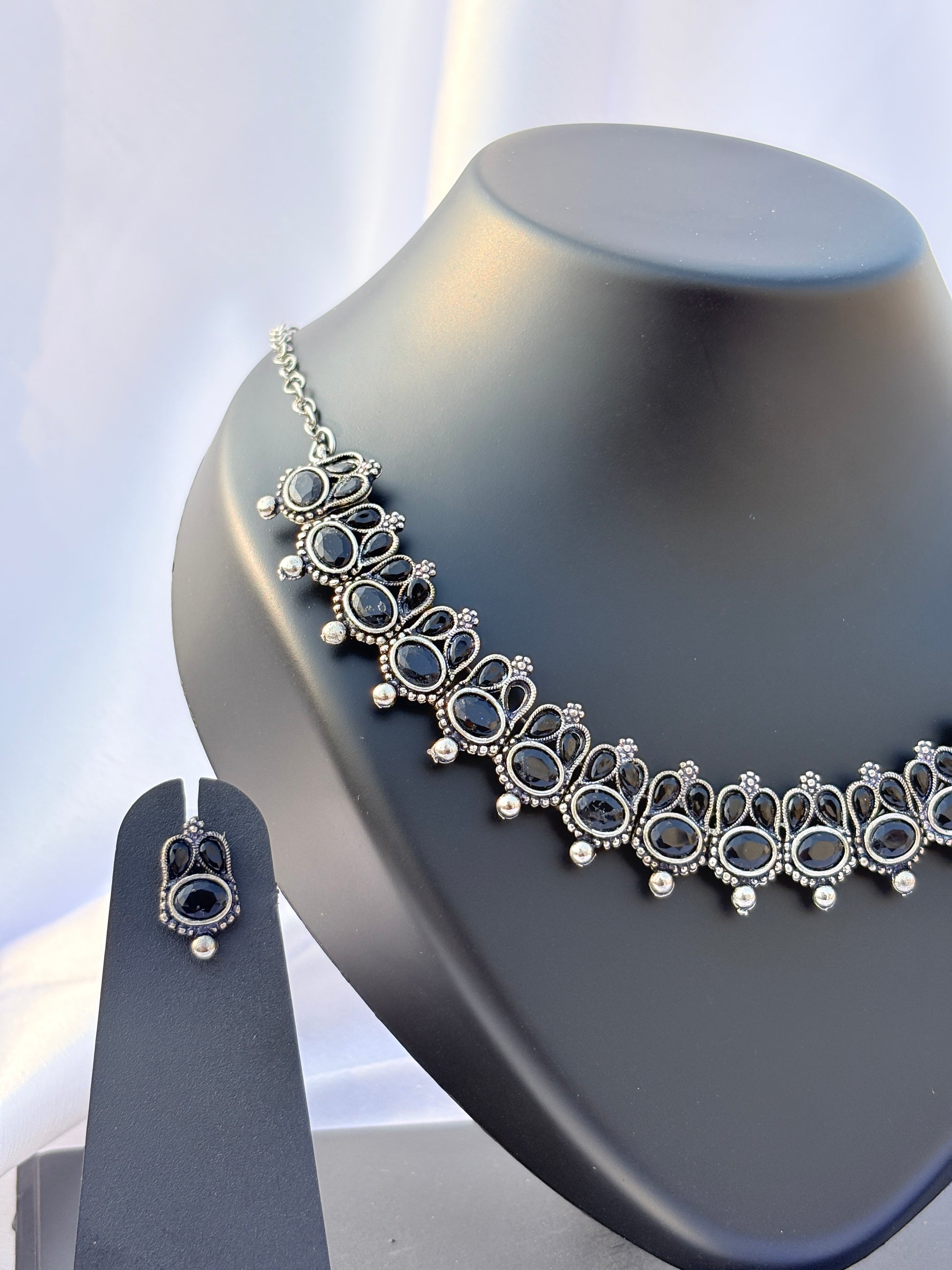 Bold yet elegant, the Tarini Antique Silver Collar Set by Divine Luxe is inspired by classic Indian heritage jewellery. Designed with intricate silver-toned detailing arranged in a structured collar silhouette, this set adds depth and character to your look. The matching earrings complete the ensemble with balanced symmetry. Lightweight and comfortable, it is perfect for long hours of wear. Ideal for festive celebrations, cultural events, and traditional gatherings, this set pairs beautifully with sarees, handloom outfits, and ethnic ensembles. A statement piece for those who appreciate timeless craftsmanship.