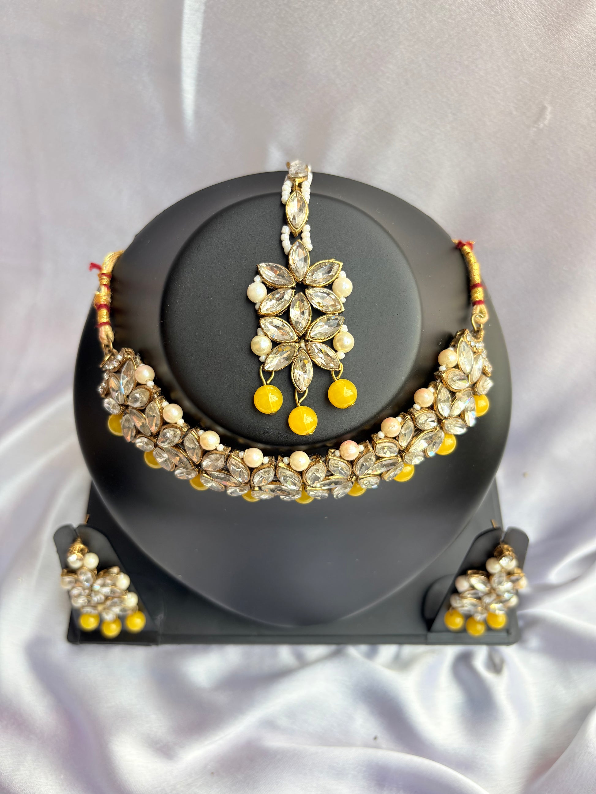 Illuminate your festive look with Divine Luxe’s Kesar Phool Kundan Choker Set, a radiant handcrafted Indian jewellery ensemble inspired by blooming marigolds and traditional bridal elegance. Designed with a rich gold-tone kundan base, this choker features intricately arranged floral motifs adorned with luminous white stones and finished with vibrant saffron-yellow bead drops that add joyful movement and warmth.