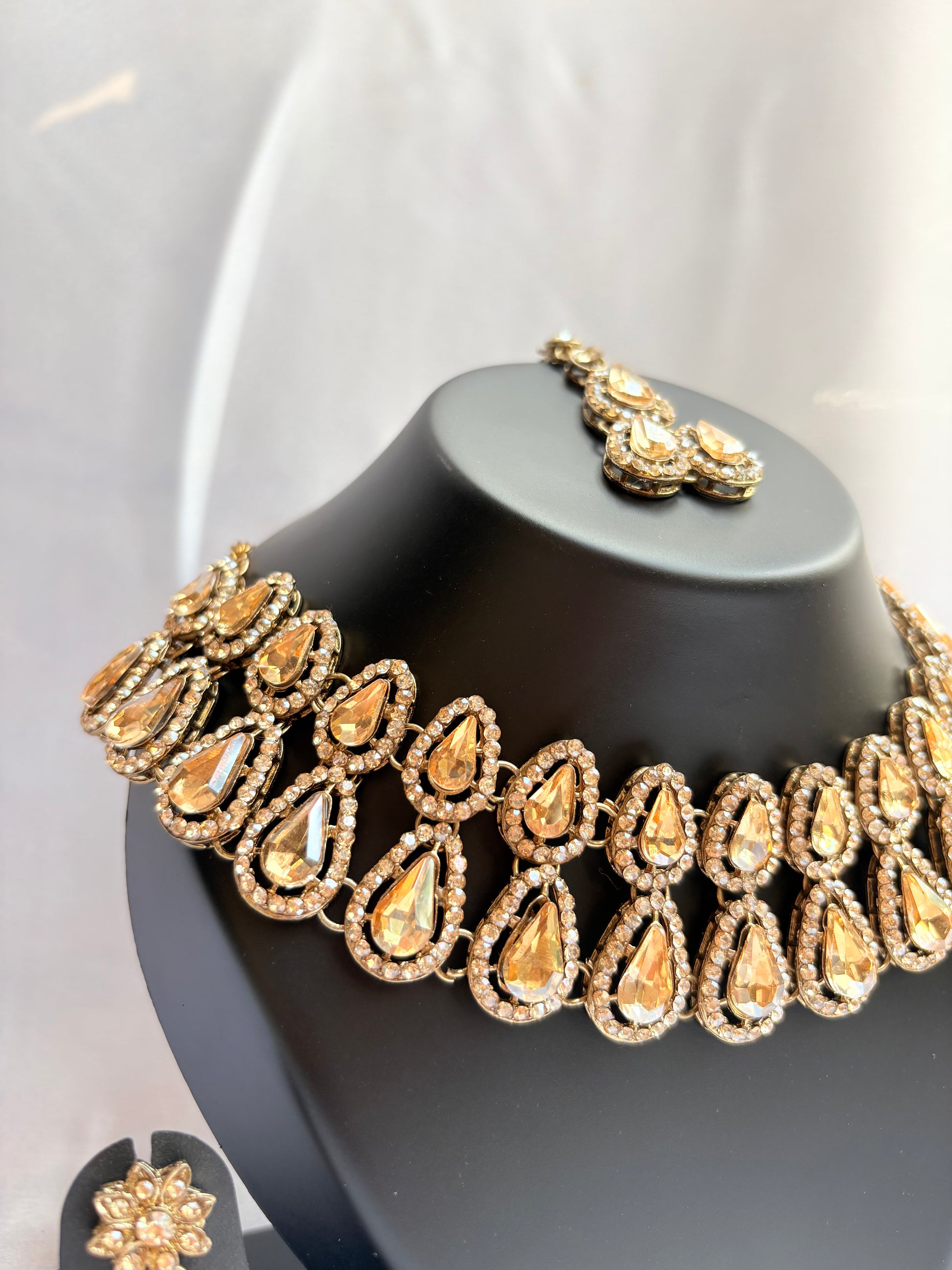 The structured collar silhouette offers a bold yet elegant presence, while the matching drop earrings mirror the tearfall design for a perfectly coordinated look. Crafted to balance statement appeal with comfortable wear, this set is ideal for long ceremonial hours without compromising on elegance.
