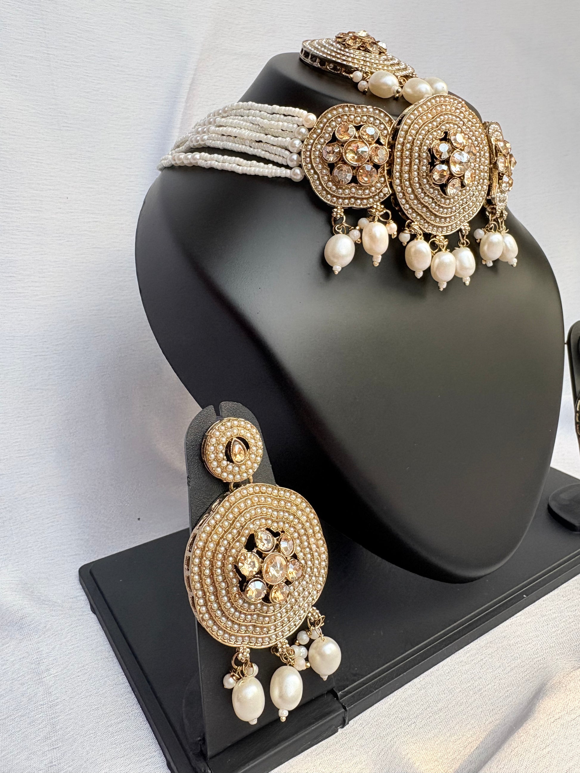 The detailed medallions reflect skilled craftsmanship, while the pearl fringes add graceful movement and soft luminosity. Paired with matching earrings and a coordinated maang tikka, this ensemble offers a complete statement look designed for comfort without compromising on grandeur.